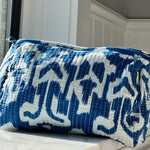 This quilted Indian Block print cosmetic bag has a waterproof lining. It is sure to brighten up your bathroom. Holds all your necessary cosmetics and creams.