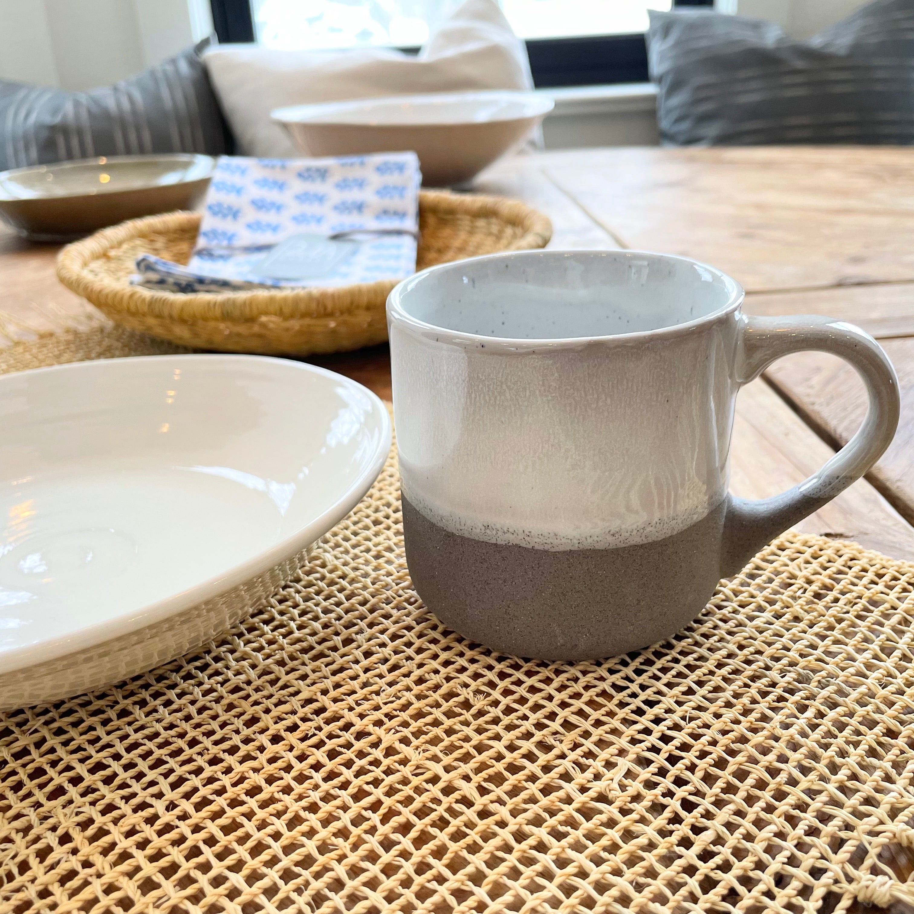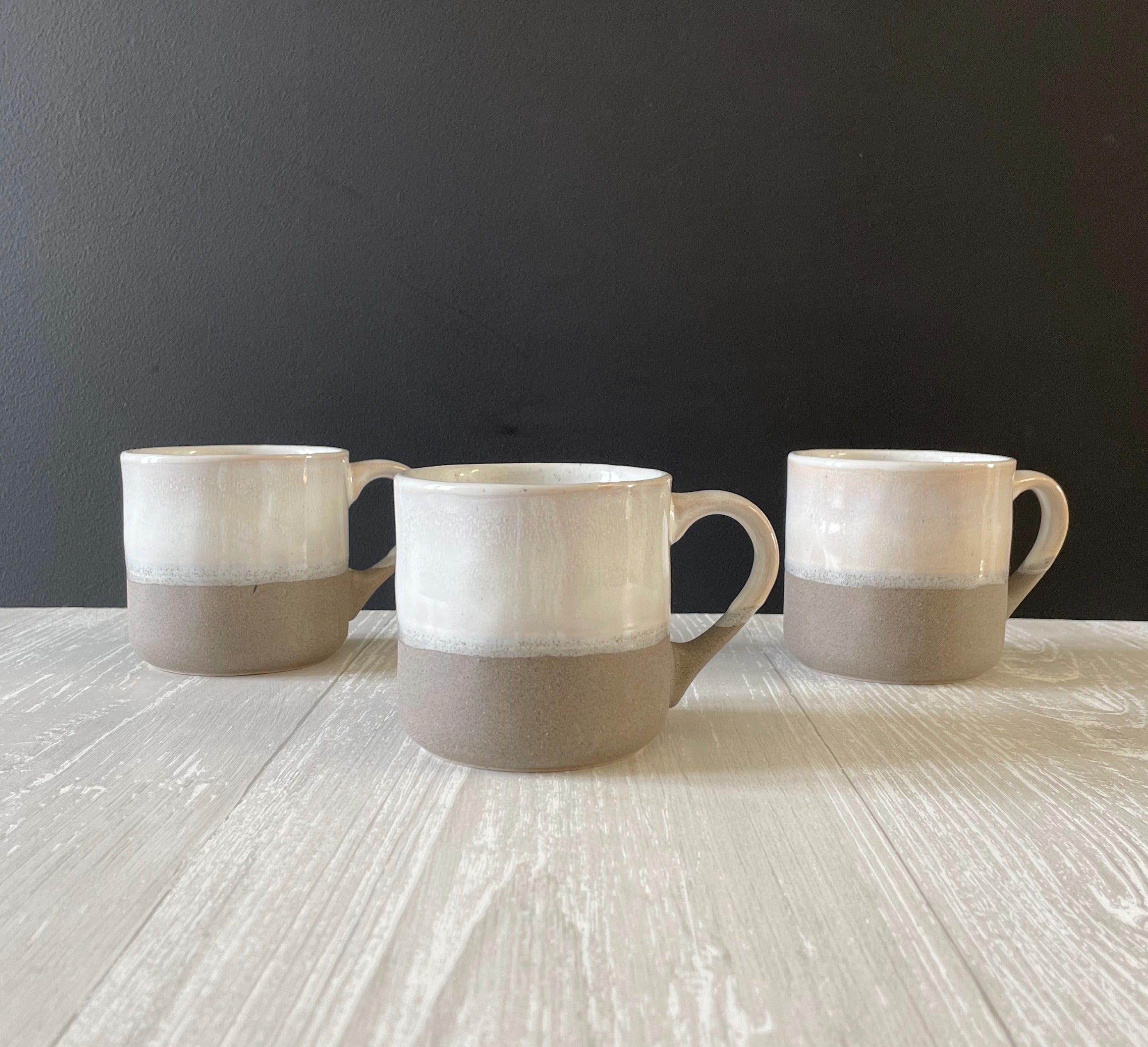 These white and grey stoneware mugs are what you will be reaching for daily for your morning caffeine kick. White area glazed, grey area left unglazed for a rough texture.